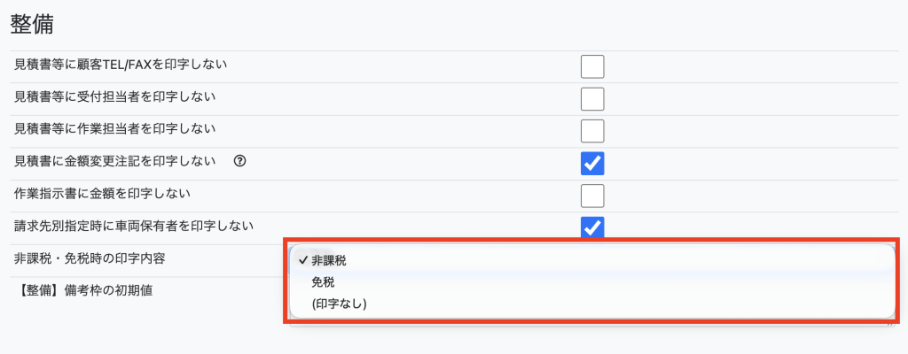 【整備】において選択できる消費税区分を「非課税・免税」とした上で、実際に印字される消費税区分は【帳票設定】の「非課税・免税時の印字内容」で選択できるようにします。
