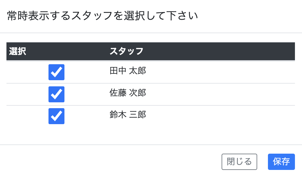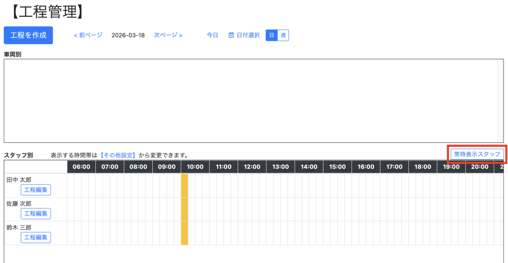 2026.03.17 【工程管理】特定のスタッフを常時表示可能に 現状、【工程管理】では表示期間内に工程データを持つスタッフのみが一覧に表示されますが、常時表示するスタッフを設定できるようにします。 あらかじめ候補となるスタッフを常時表示しておくことで、スタッフの空き枠を確認しながら、工程を作成できます。
