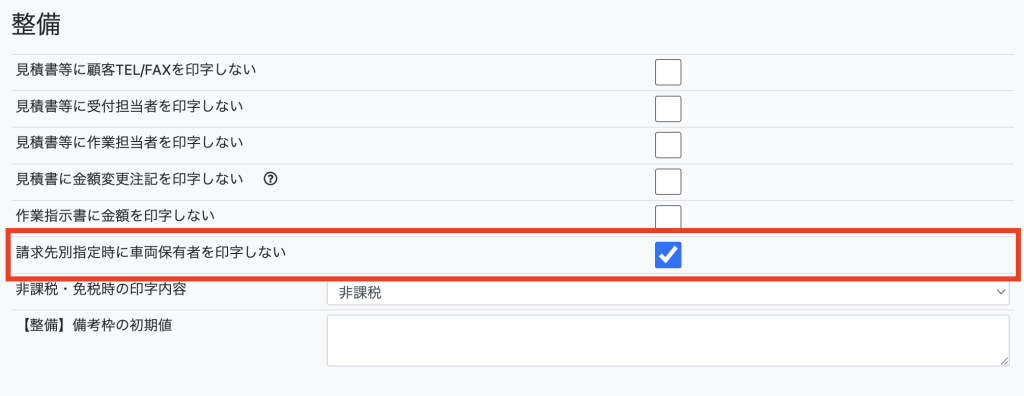 【整備】において請求先別指定をした際、備考欄に車両保有者が「保有者:◯◯◯◯」と印字されますが、これを印字されないようにできると嬉しいです。